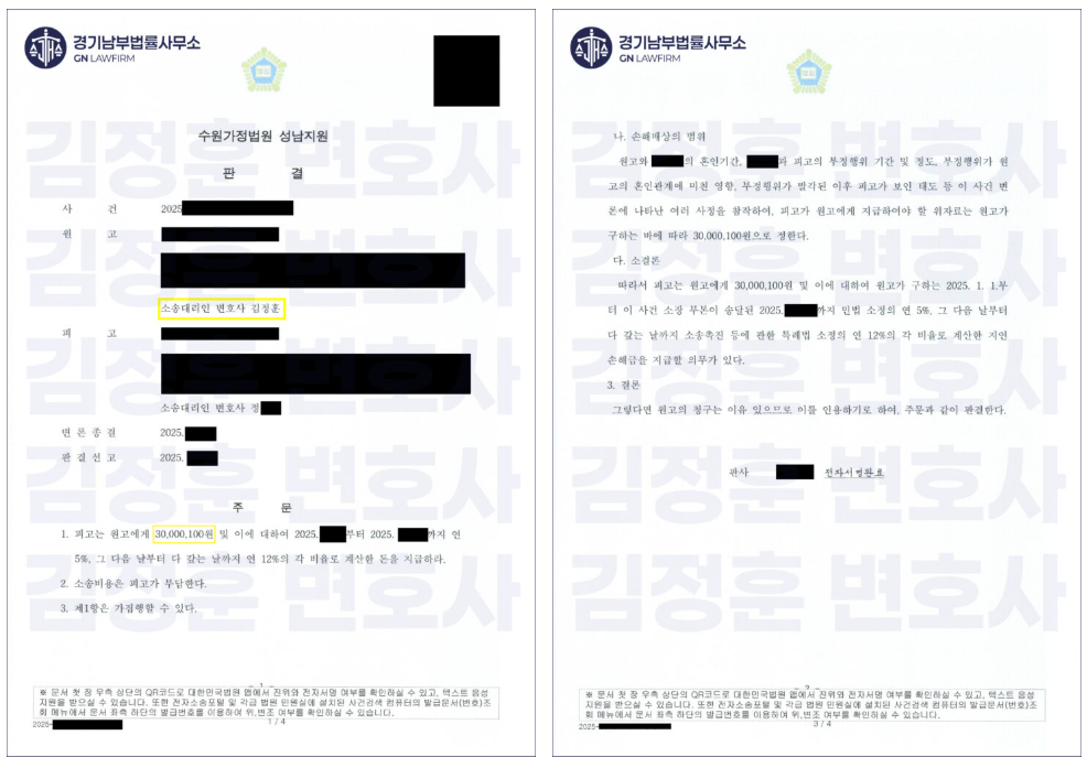 이번 사건은 바로 그 불리한 조건 추가 부정행위자의 존재를 정면 돌파하여, 청구액 3,000만 원을 단 한 푼도 깎이지 않고 전액 인정받은 사례입니다.