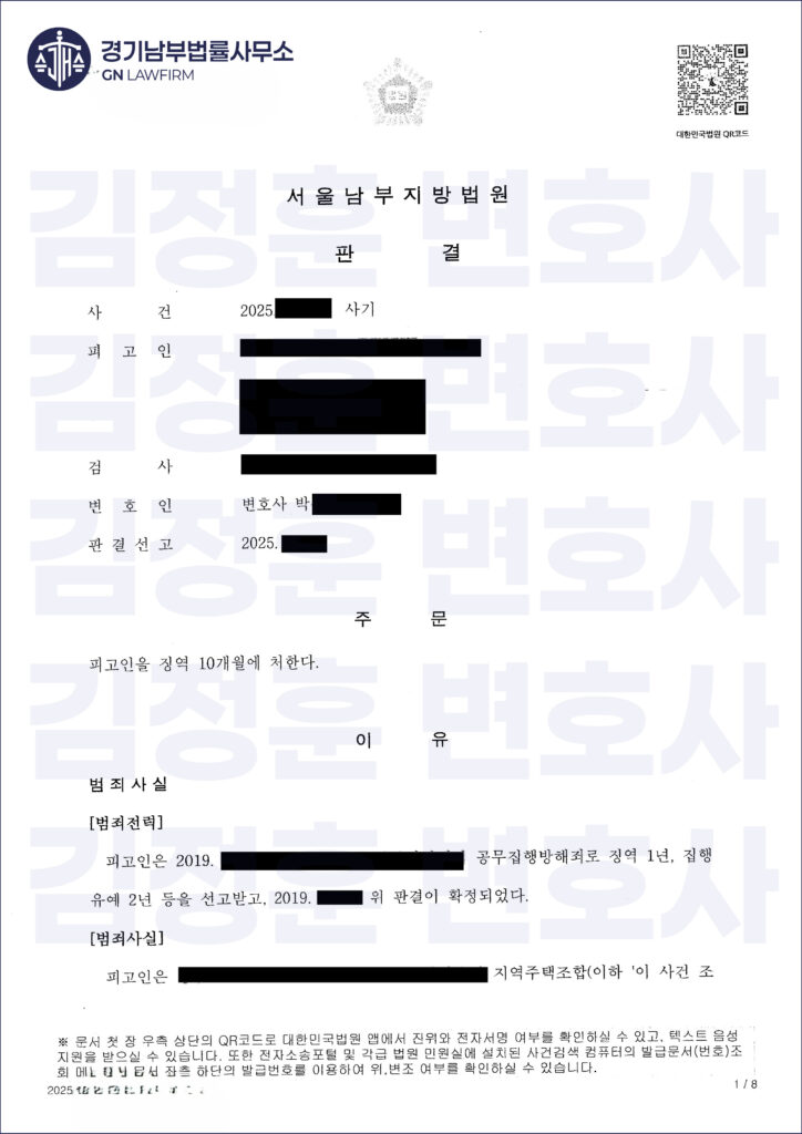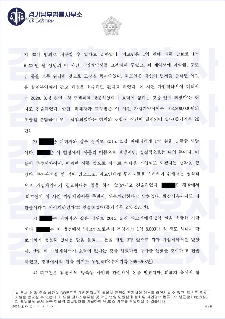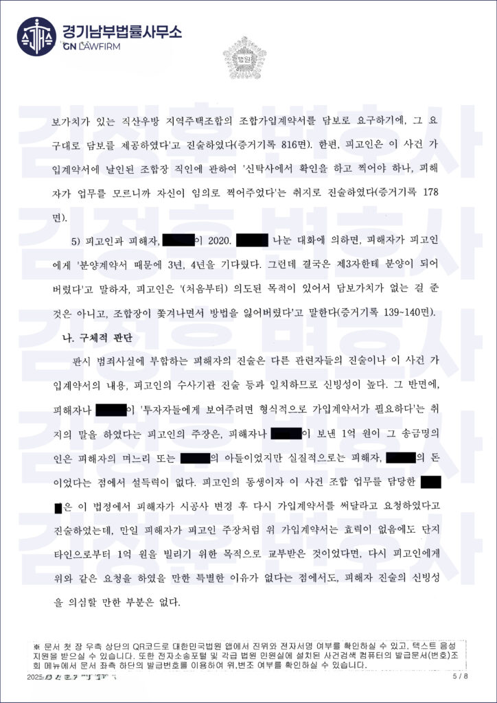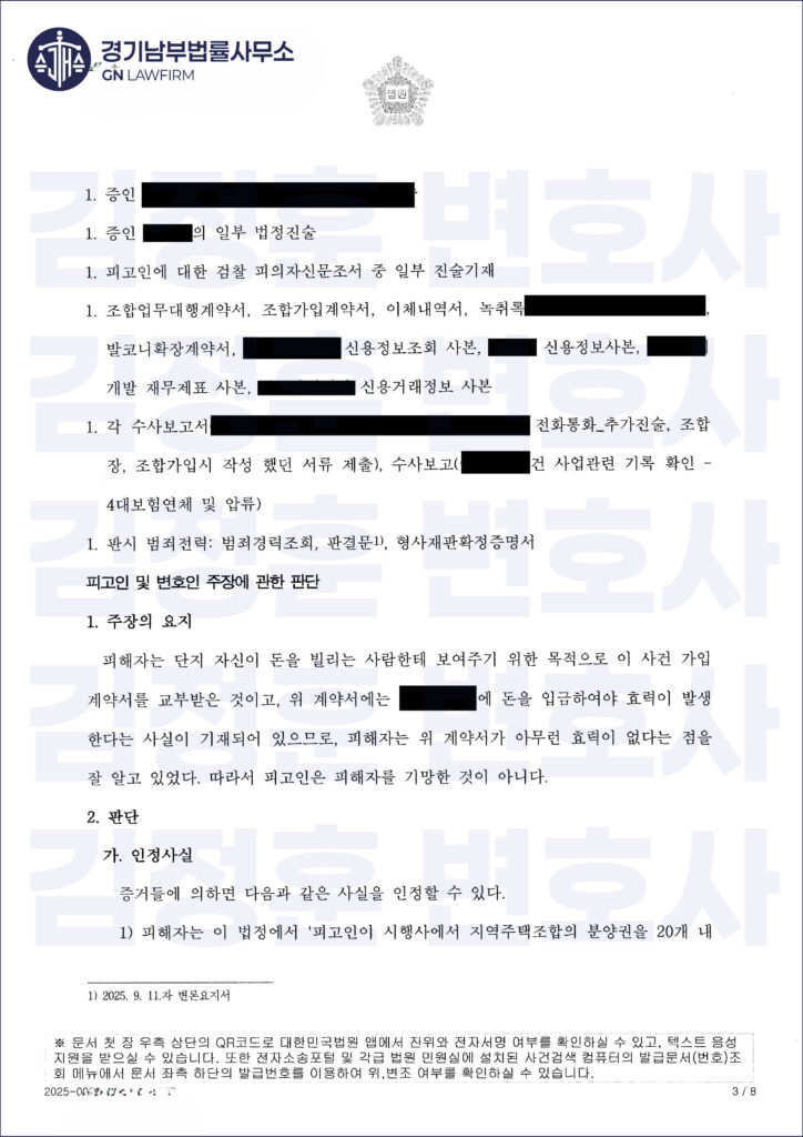 하지만 이후 부동산 경기 악화로 사업이 지연되었고, 고소인은 해당 계약서가 사실상 분양 효력이 없거나 조합원 자격이 인정되지 않는 ‘깡통 서류’라며 의뢰인을 사기죄로 고소했습니다.