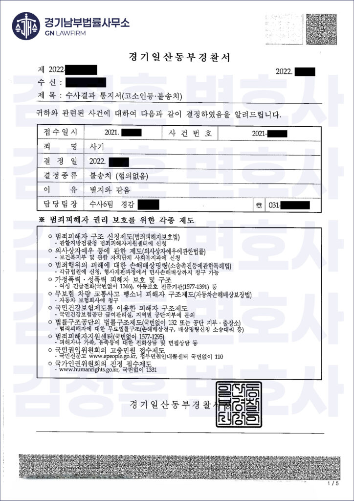 수사기관(경찰)은 저희의 변론을 받아들여 ‘불송치(혐의없음)’ 결정을 내렸으며, 관련 재판에서도 의뢰인은 자신의 결백을 온전히 증명받을 수 있었습니다.