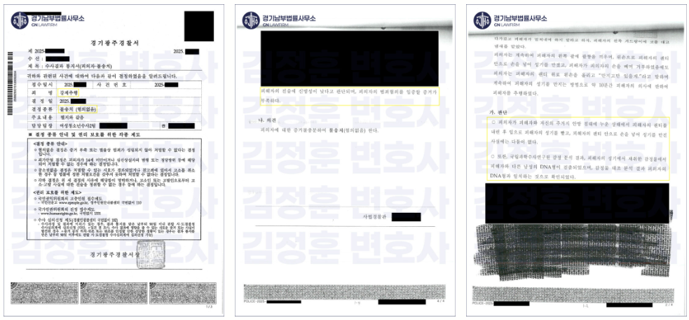 실제 불송치 결정서에는 “피해자의 진술에 신빙성이 낮다고 판단되며, 피의자의 범죄혐의를 입증할 증거가 부족하다”는 판단이 명시되어 있습니다. 이는 DNA 증거라는 불리한 조건 속에서도 변호인의 논리가 수사기관을 설득하는 데 성공하였음을 보여줍니다.