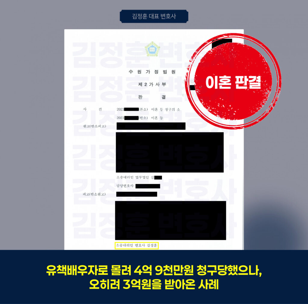 안녕하세요, 경기남부법률사무소 김정훈 변호사입니다. 오늘은 배우자로부터 유책배우자로 지목되어 거액의 위자료와 재산분할 소송을 당했던 의뢰인을 대리한 사례를 소개해[…]